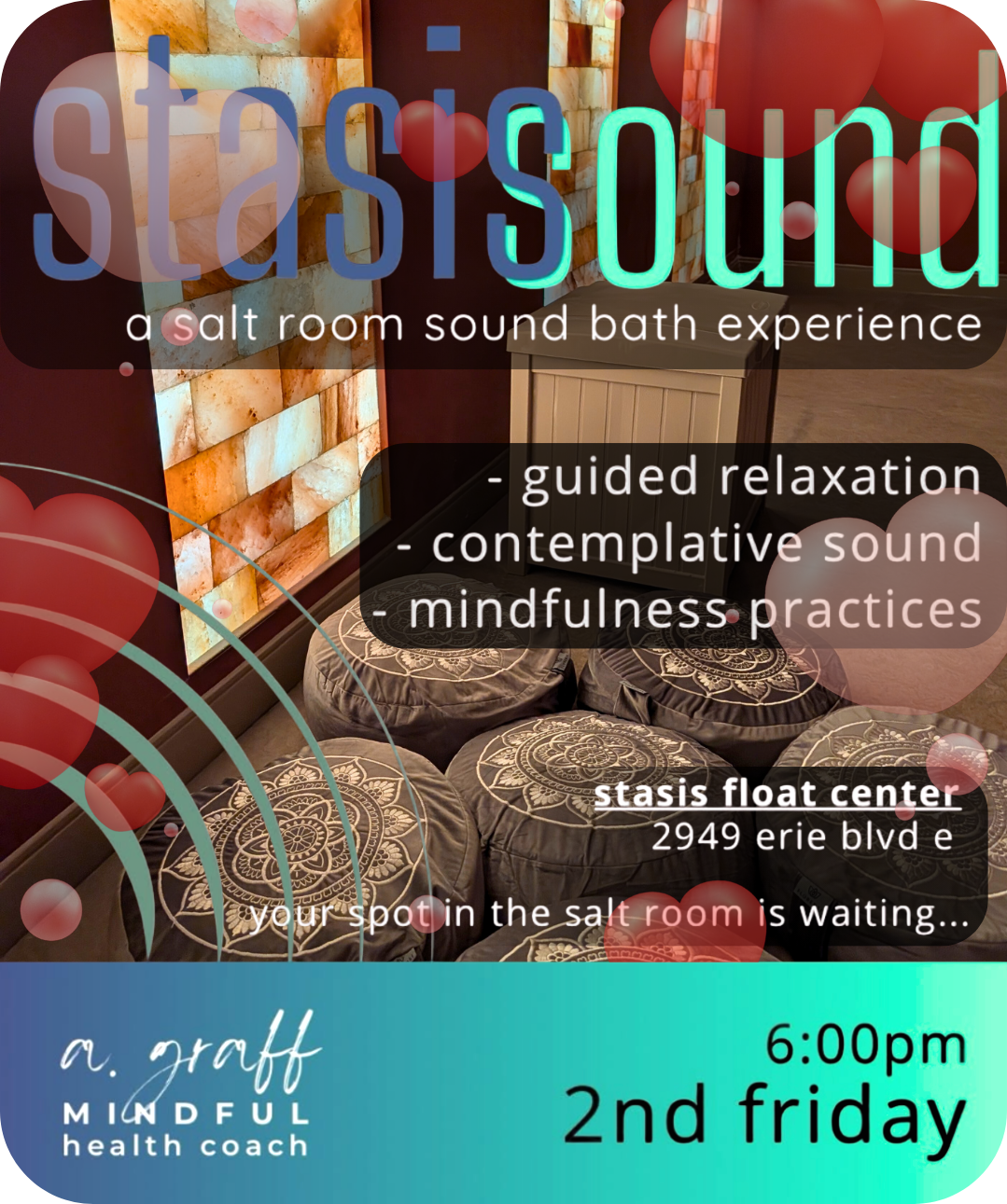 🗓️ Held the second Friday of each month, this seasonal series will next take place on Friday, February 13th. With Valentine’s Day weekend following closely behind, this session can also make for a meaningful shared experience for couples who want to slow down and reconnect in a calm and restorative setting. It offers a unique opportunity to settle in together through contemplative sound and mindfulness practices in the healing environment of our Salt Room.